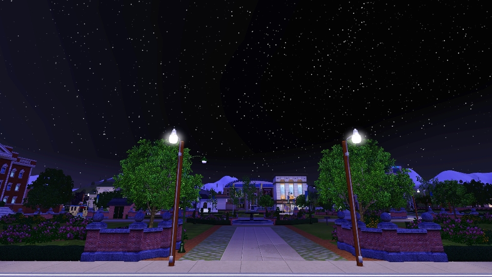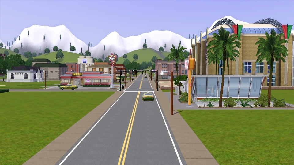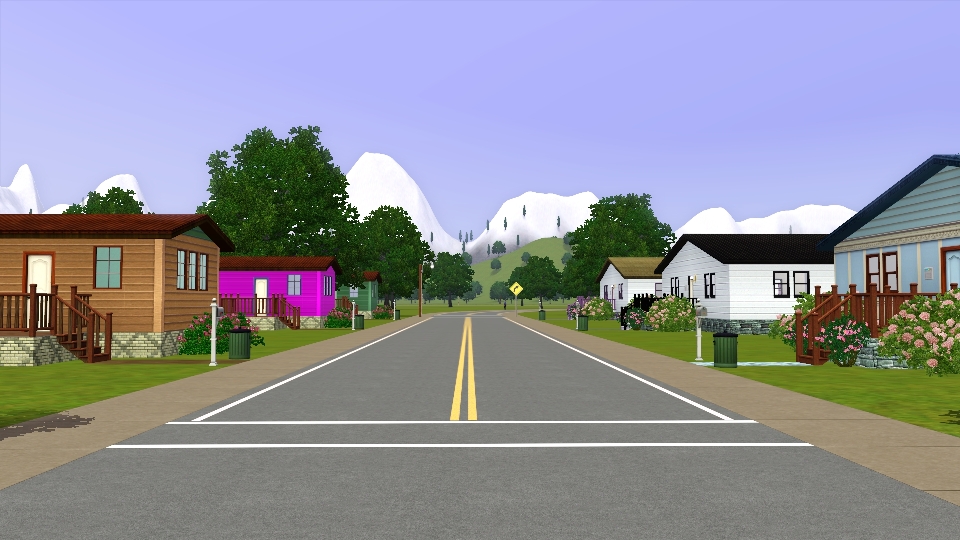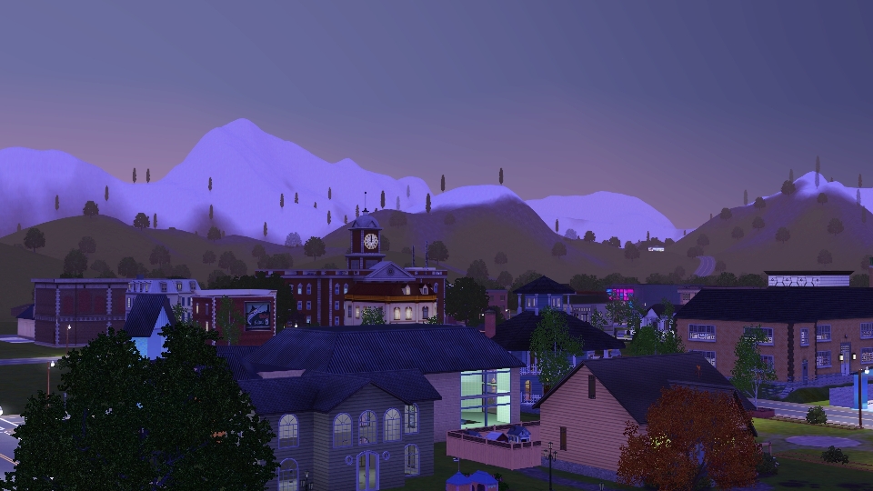 I have created a world called Alryne Valley for The Sims 3. The town faces Sunrise Beach and Maramore Ocean to the east and is surrounded on three sides by snow-covered mountains. All commercial buildings and venues are located on individual lots (no combination rabbit holes).