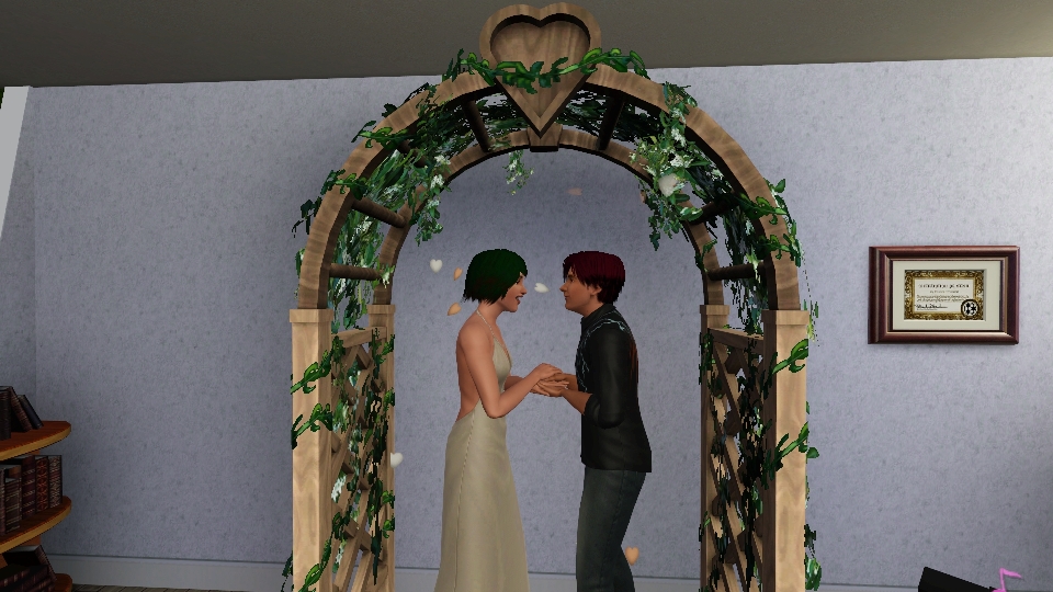 Those in attendance at the wedding: Samuel, Lucy, Bosco hiding behind the arch, Michelle, Sheldon, Patti, and Shaun. Sheri was looking out the window to the left, and Tennille was making an inappropriate forum post in the nursery-turned-office.