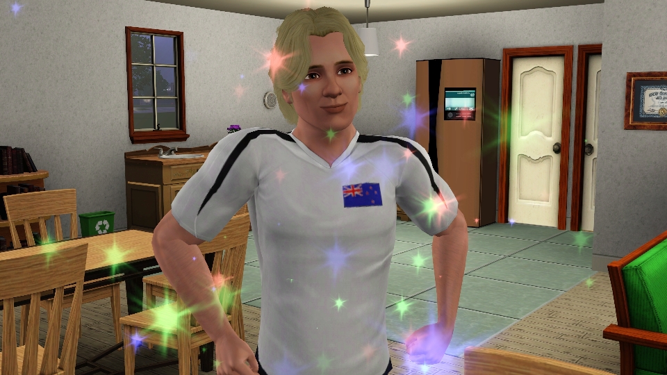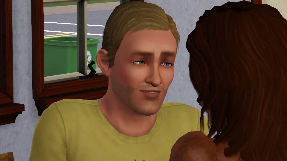 Sheri asked him to move in. He joined the family with §14,000. Because he lived in a household with another Sim, albeit in another world, I decided it was okay for the family to keep the Simoleons. Typically, those living alone bring §20,000, so…