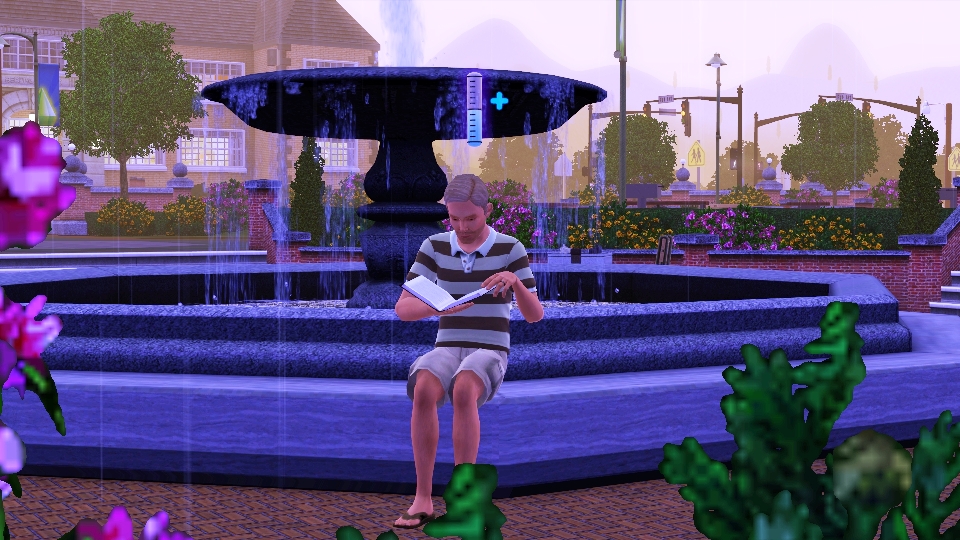 Brian sits on the edge of the fountain in Alryne Park to read the third volume of the handiness books.