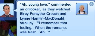 ~texansky~ “‘Ah, young love.’ commented an onlooker, as they watched Elroy Forsythe-Crouch and Lynne Hamlin-MacDonald stroll by. ‘I remember that feeling. When the romance was fresh. Ah…’”