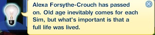 ~texansky~ “Alexa Forsythe-Crouch has passed on. Old age inevitably comes for each Sim, but what’s important is that a full life was lived.”