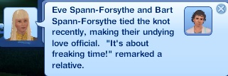 ~texansky~ “Eve Spann-Forsythe and Bart Spann-Forsythe tied the knot recently, making their undying love official. ‘It’s about freaking time!’ remarked a relative.”