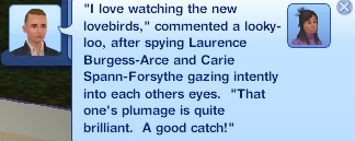 ~texansky~ “‘I love watching the new lovebirds,’ commented a looky-loo, after spying Laurence Burgess-Arce and Carie Spann-Forsythe gazing intently into each others eyes. ‘That one’s plumage is quite brilliant. A good catch!’”