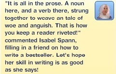 ~texansky~ “‘It’s all in the prose. A noun here, a verb there, strung together to weave an tale of woe and anguish. That is how you keep a reader riveted!’ commented Isabel Spann, filling in a friend on how to write a bestseller. Let’s hope her skill in writing is as good as she says!”