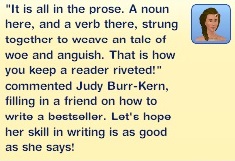 ~texansky~ “‘It is all in the prose. A noun here, and a verb there, strung together to weave an tale of woe and anguish. That is how you keep a reader riveted!’ commented Judy Burr-Kern, filling in a friend on how to write a bestsetter. Let’s hope her skill in writing is as good as she says!”