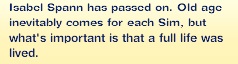 ~texansky~ “Isabel Spann has passed on. Old age inevitably comes for each Sim, but what’s important is that a full life was lived.”