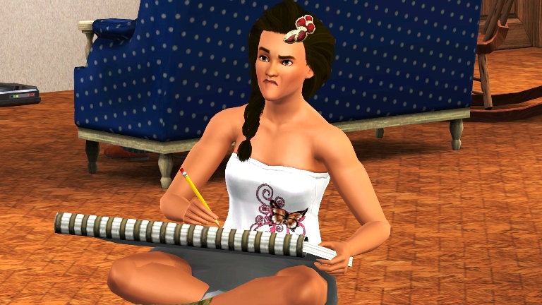 Judy is hard at work practicing her sketching. It appears that she may be drawing Derek.