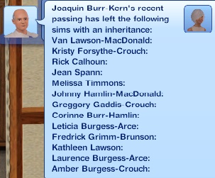 ~texansky~ “Joaquin Burr-Kern’s recent passing has left the following sims with an inheritance: Van Lawson MacDonald, Kristy Forsythe-Crouch, Rick Calhoun, Jean Spann, Melissa Timmons, Johnny Hamlin-MacDonald, Greggory Gaddis-Crouch, Corinne Burr-Hamlin, Leticia Burgess-Arce, Fredrick Grimm-Brunson, Kathleen Lawson, Laurence Burgess-Arce, Amber Burgess-Crouch.”