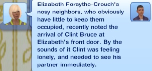 ~texansky~ “Elizabeth Forsythe-Crouch’s nosy neighbors, who obviously have little to keep the occupied, recently noted the arrival of Clint Bruce at Elizabeth’s front door. By the sounds of it Clint was feeling lonely, and needed to see his partner immediately.”