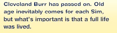 ~texansky~ “Cleveland Burr has passed on. Old age inevitably comes for each Sim, but what’s important is that a full life was lived.”