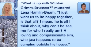 ~texansky~ “‘What is up with Weston Grimm-Brunson?’ muttered Lena Hamlin-Beam. ‘I just want us to be happy together, is that all? I mean, he is all I think about, why can’t he see me for who I really am? A loving and compassionate sim who just happens to be camping outside his house.’”