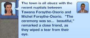 ~texansky~ “The town is all abuzz with the recent nuptials between Tawana and Michel Forsythe-Osorio. ‘The ceremony was so… beautiful,’ remarked a close friend, as they wiped a tear from their eye.”