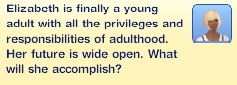 ~texansky~ “Elizabeth is finally a young adult with all the privileges and responsibilities of adulthood. Her future is wide open. What will she accomplish?”