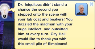 ~texansky~ “Dr. Iniquitous didn’t stand a chance the second you stepped onth the scene with your lab coat and beakers! You dazzled the madman with your huge intellect, and outwitted him at every turn. City Hall would like to thank you with this small pile of Simoleons!