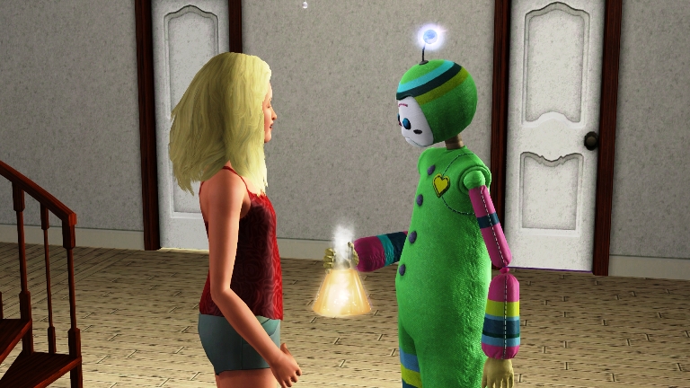 Angelia discovered the potion to make imaginary friends real. She gave the first one to Ayce. He offered it to his imaginary friend Amos who quickly drank it down.